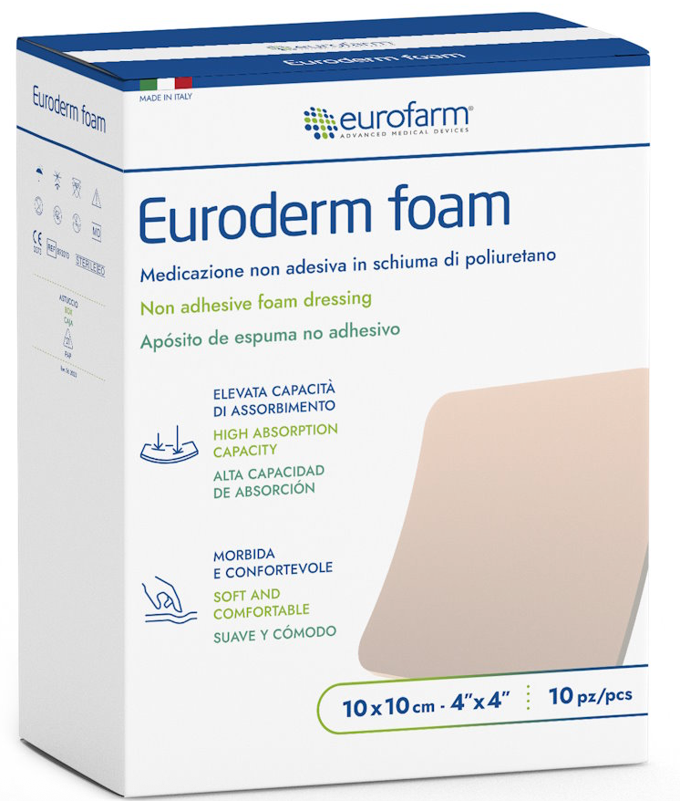 EURODERM FOAM, es un apósito estéril con toda una superficie hidroactiva, compuesto por una capa de espuma de poliuretano altamente absorbente que garantiza la absorción vertical del exudado, una capa intermedia de PU altamente absorbente, y una película externa de poliuretano transparente que evita la maceración de la zona perilesional. El apósito se ajusta perfectamente al lecho de la herida, favoreciendo el entorno ideal para el proceso de cicatrización. La gran capacidad de absorción del apósito de espuma de PU permite reducir el número de cambios de apósito, al tiempo que garantiza la comodidad del paciente y reduce los costes de tratamiento de la herida. No provoca maceración de los bordes perilesionados. Se puede cortar sin sufrir alteración de su capacidad de absorción.