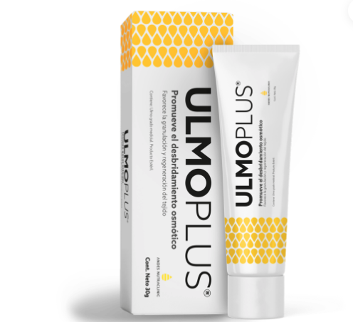 Miel grado médico para curaciones compuesto de miel pura de Eucryphia cordifolia Chilena (Ulmo), grado NHF (Native Honey Factor) certificación que asegura el origen botánico y niveles significativos de bioactividad. Está suplementado con ácido ascórbico. ULMOPLUS posee un bajo pH y alta osmolaridad que favorece el desbridamiento autolítico, posee además propiedades bactericidas, controla olores, es de fácil aplicación y remoción sin causar traumas en la lesión.